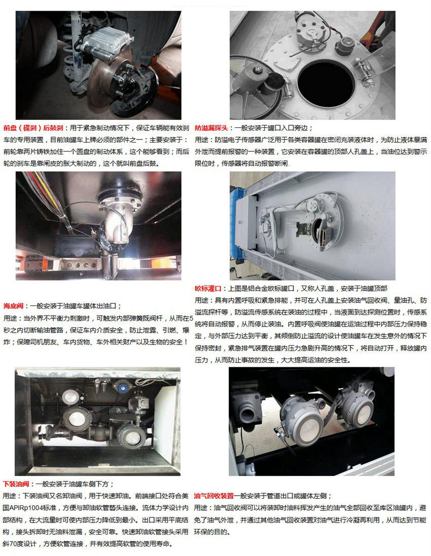 最大可装4.5吨汽油,5.3吨柴油,采用5MM武钢板材制作(质量保证);罐体一次性卷压成型,龟背型封头,永不变形,罐体内部每2米加装一块波纹形防浪板,满载时刹车可有效减少罐体对车体的冲击力,起到安全防护作用,全自动无缝焊接,100%通过液体渗透、气压检测、探伤检测等苛刻要求,且出具正规检测报告,(产品更安全,保障)!B、罐体常配为单仓、申威油泵,泵箱配欧标拉手锁,一个单呼吸阀的欧标罐口、一个海底阀,两个自流阀,配备上海柏莱税控加油机、三金税控加油机、中升税控加油机,15米要求自动回位卷盘。加油机装在罐体前部,也可以装在车架一侧,网状走道上配折叠护拦。(使用更方便、快捷,有效提高工作效率!)C、带配两个2kg灭火器,两根与罐体等长的输油管,防火帽,接地静电线,(安全第一,预防为主!)D、油漆:铝粉银灰,易燃液体贴,贴反光标志,安全告示!