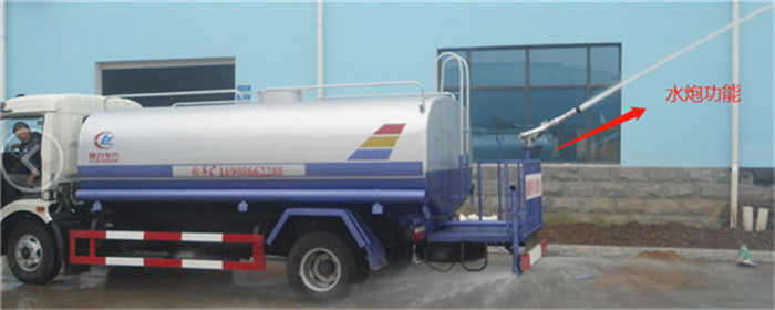 前喷后洒,前装有万象鸭子嘴或圆头冲嘴,后面装有圆柱开洒水喷嘴或莲蓬头喷嘴,后部有一工作平台,装配有水炮。后部还可装喷嘴(选装)喷水器一般用于冲洗街道。