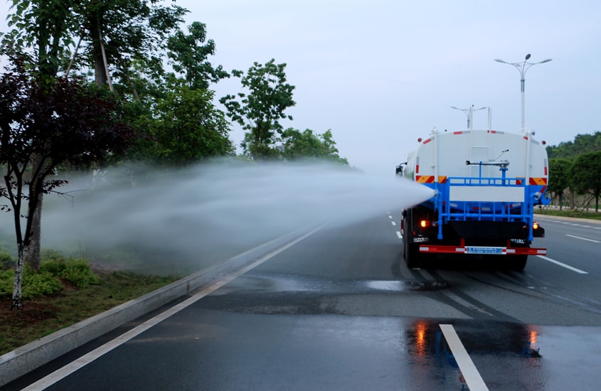 由发动机带动变速箱,变速箱上安装的带动专用洒水泵,洒水泵产生主要动力,将罐体内部的水通泵加压,在通过管网出去。自吸高度:≤7m,洒水宽度:≥20m,最大射程:≥35m;可调节成柱状,也可调节成雾状。