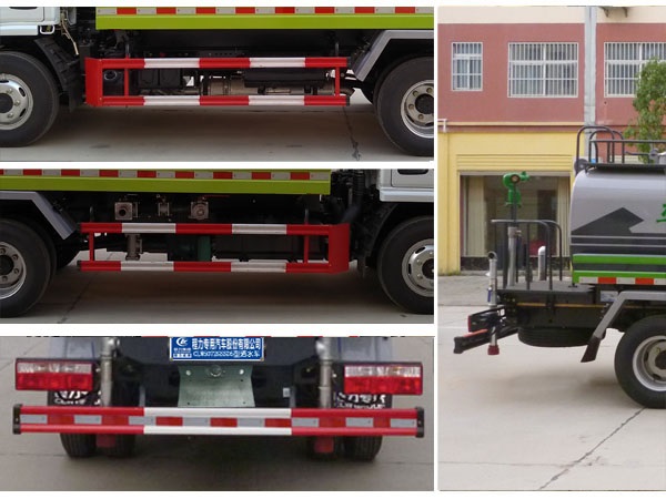 前喷后洒,前装有万象鸭子嘴或圆头冲嘴,后面装有圆柱开洒水喷嘴或莲蓬头喷嘴,后部有一工作平台,装配有水炮。后部还可装喷嘴(选装)喷水器一般用于冲洗街道。