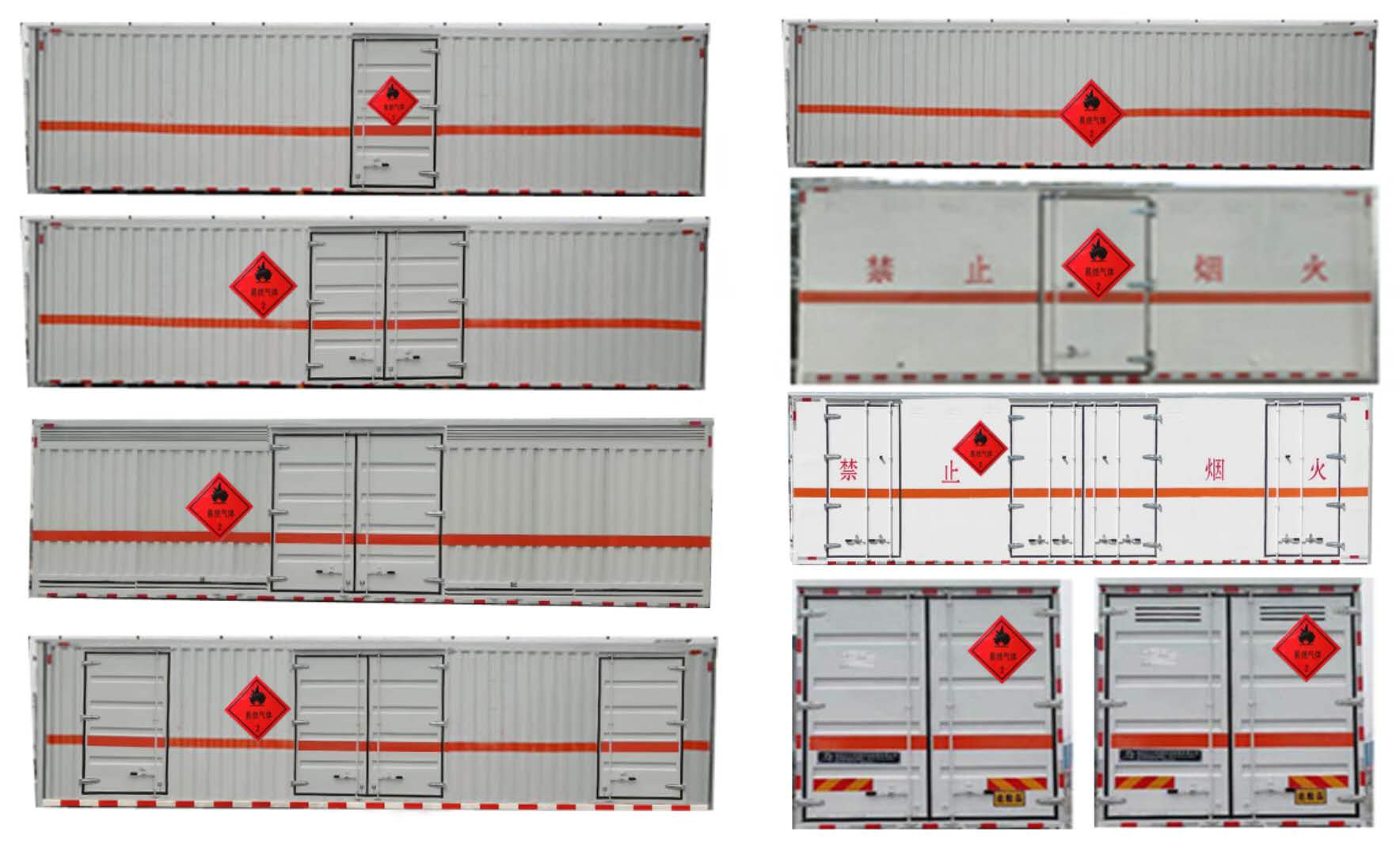 | 该车为危险品运输车.该车顶部封闭,不可开启.随底盘选装驾驶室.运输介质容器(瓶)包装的:液化石油气,压缩天然气,压缩氢气,乙炔,丁烷,丙烷,丁烯,丙烯,甲乙醚,打火机或打火机加油器,类项号2.1;运输独立容器(瓶)包装的非易燃无毒气体:压缩空气,压缩氧,二氧化碳,压缩氮,压缩氦,压缩氩,压缩氖.类项号2,.选挂2.1类易燃气体警示牌或2.2类非易燃无毒气体警示牌.选装侧开门型式及位置;厢体选装开百叶窗,选装后部样式.仅采用排气管前置,子午胎,限速装置,辅助制动装置和前盘制动器的底盘;限速80km/h.安装具有卫星定位功能的行驶记录仪;ABS系统生产厂家,后轴仅采用空气悬架.转向轴已安装防爆胎装置. | |||